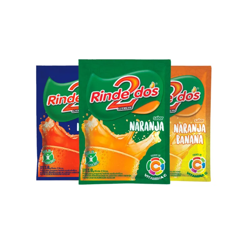 Jugo Rinde 2 pack x10 sobres de 13g. Bebida en polvo práctica, económica y disponible en varios sabores.